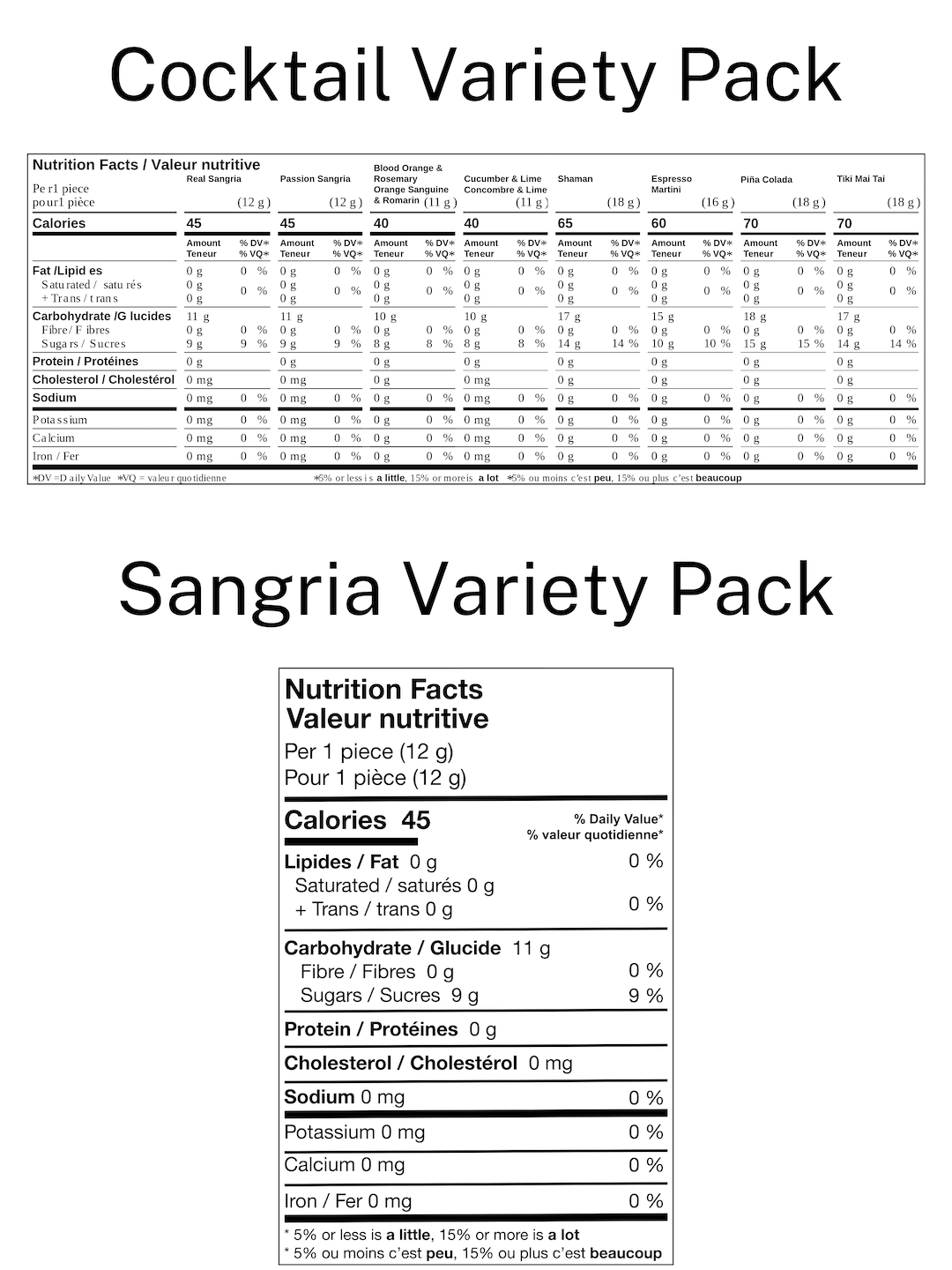 - Espresso Martini: Sucres (sucre, maltodextrine), arôme naturel, café instantané, cacao en poudre.