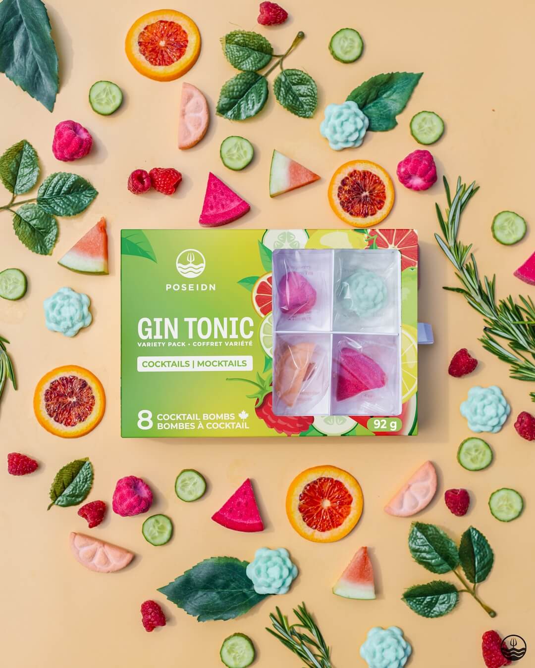 Un assortiment de 8 délicieuses Bombes à Cocktail de 4 saveurs distinctes pour les amateurs de Gin Tonic (ou de Mocktail) !