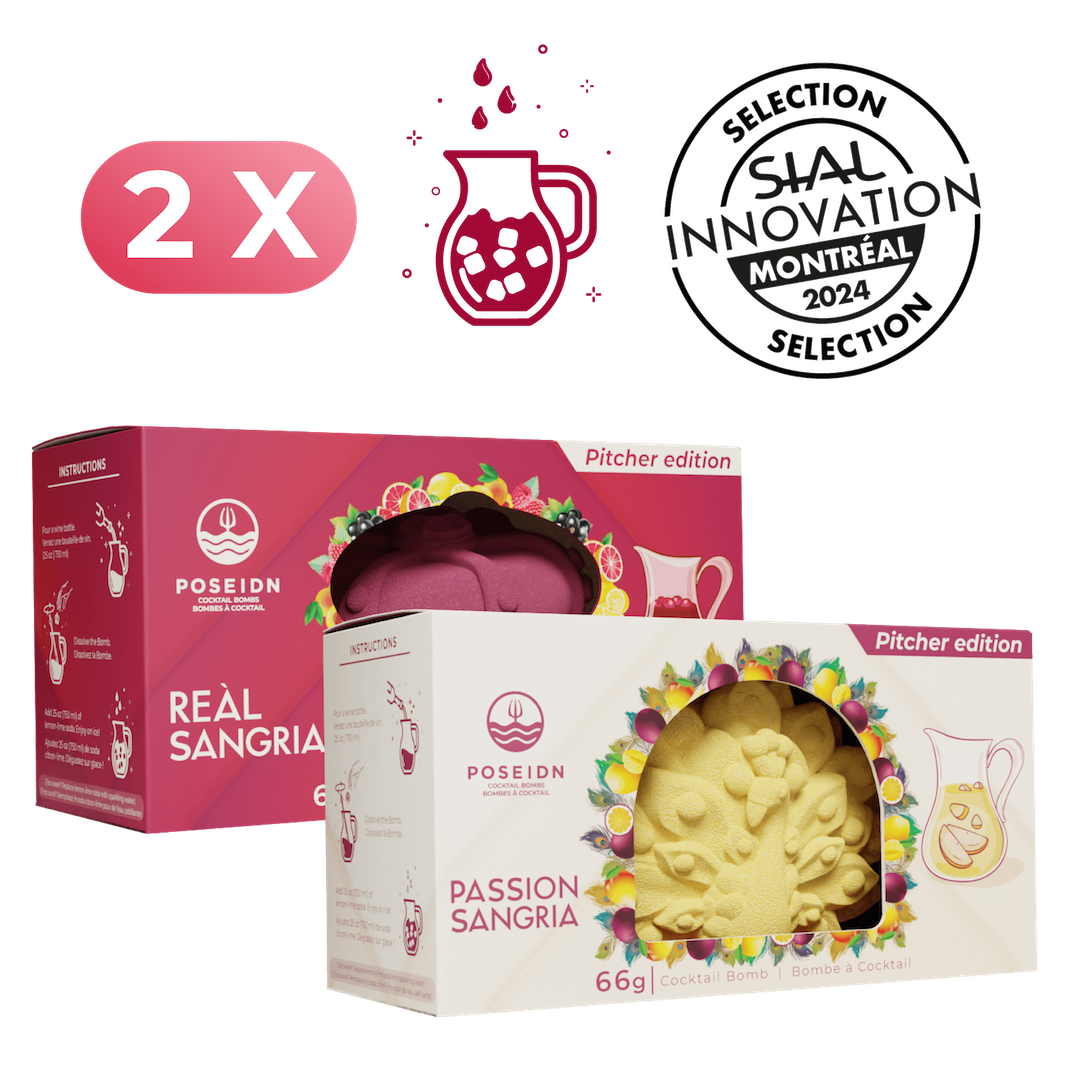 Ce qui est mieux que de boire un verre de Sangria, c'est d'avoir un pichet à partager ! Obtenez maintenant nos 2 saveurs en Duo ! Notre dernière innovation, le Bombe à Cocktail Pitcher Edition fait 50 oz (6 à 8 portions) avec seulement 1 plus grand Bombe à Cocktail. Il est plus facile que jamais de préparer un délicieux Pitcher Passion Sangria (approuvé par les mixologues) à partager avec vos amis et votre famille lors de vos prochaines activités en plein air, fêtes de piscine, barbecues, pique-niques, et bien plus encore !